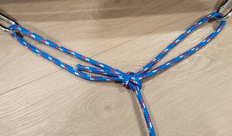This is an excellent variant of the Bowline Knot. Its particular use is when you need to secure or pull something in a certain direction but don't have a support where you need it. This knot allows you to suspend your force at an adjustable location between two tie-off points. Just like a regular bowline, it doesn't bind up and you can always untie it even after a heavy load is applied. For this knot i primarily tie it with the snap method as it allows me to simply thread through my two tie-off points and then tie it. No guessing required on how big to make the loops.