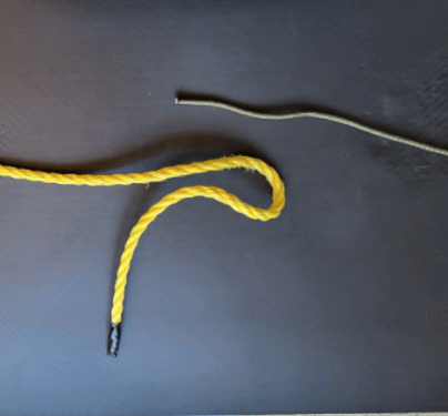 Shown here is an incorrectly tied sheet bend, sometimes called a left-handed sheet bend. The tag ends comes out on opposite sides and the knot is less stable and strong.