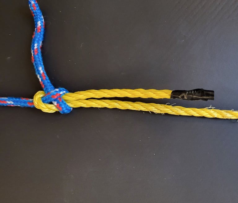 This is an easy bend to join 2 ropes together. It works well with 2 dissimilar ropes as well. The name "Sheet Bend" comes from people using it to tie the corner of a sheet. It works well for tarps or heavy plastic too, especially if you don't have a grommet to tie through. Just grab a handful of the corner and fold it over to make a bight, then tie the rope with this knot.